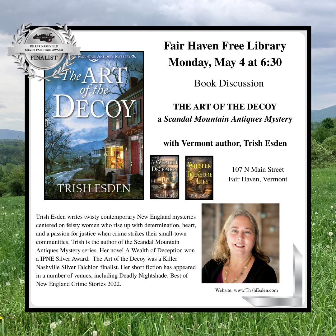 Trish Esden writes twisty contemporary New England mysteries centered on feisty women who rise up with determination, heart, and a passion for justice when crime strikes their small-town communities. Trish is the author of the Scandal Mountain Antiques Mystery series. Her novel A Wealth of Deception won a IPNE Silver Award. The Art of the Decoy was a Killer Nashville Silver Falchion finalist. Her short fiction has appeared in a number of venues, including Deadly Nightshade: Best of New England Crime Stories 2022.